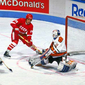 Soviet Sergei Makarov looks for the rebound in behind NHL goaltender Grant Fuhr. The teams split the two-game exhibition challenge.