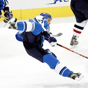 Finland's Jarkko Ruutu goes flying in World Cup 2004 semi-final action against Team USA.