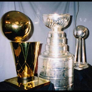 (June, 2004) The Stanley Cup is bookended by the Larry O'Brien NBA Championship Trophy (left) and the WNBA Championship Trophy. All three were won by teams owned by business magnate Bill Davidson.