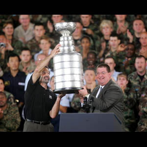 (June, 2004) Coach John Tortorella (left) and GM Jay Feaster raise the Stanley Cup to thunderous applause from the 5,000 personnel on hand at the MacDill Air Force Base. (Walt Neubrand)