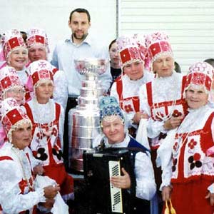 (July, 2004) At an Arkhangelsk brewer, Dmitry Afanasenkov was greeted by performers dressed in traditional Russian costumes. Although briefly considering the suggestion of re-designing Tampa's jerseys to reflect his heritage, Afanasenkov decided he really liked the Lightning bolt! (Mike Bolt)