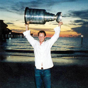 (August, 2004) The sunset at Pier 60 was sensational, and Nolan Pratt took advantage to pose with the Stanley Cup in the magnificent glow of a Tampa evening. (Mike Bolt)