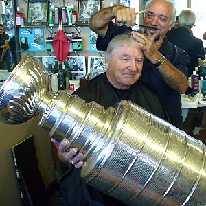 "Just a little off the Cup, okay Franco?" Scout Tony MacDonald took the Stanley Cup to Guelph, Ontario for a trim. (Walt Neubrand/HHOF)