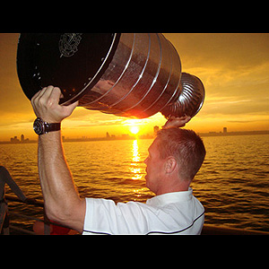 Taking in a beautiful sunset over Lake Ontario, Kris Draper hoists the Stanley Cup during his boat cruise. (Bill Wellman/HHOF)