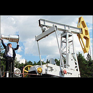 Atop an oil rig in his native Russia, Pavel Datsyuk proudly hoists the Stanley Cup. (Mike Bolt/HHOF)