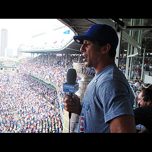 Chris Chelios leads baseball's famous seventh-inning-stretch mantra 'Take Me Out to the Ball Game' at Wrigley Field. (Mike Bolt/HHOF)
