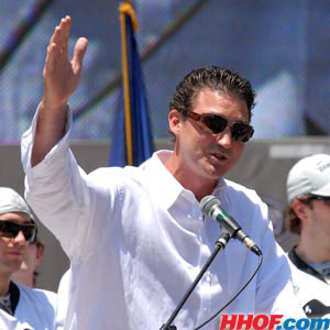 Co-owner and Chairman of the Pittsburgh Penguins Mario Lemieux salutes the crowd. (Craig Campbell/HHOF)