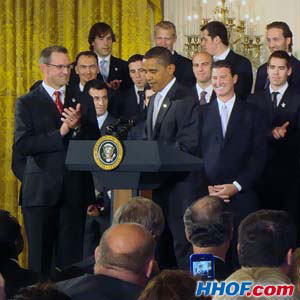 U.S. President Barack Obama welcomes the 2009 Stanley Cup Champions to the White House. (Bill Wellman/HHOF)