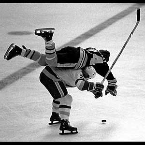 Boston Bruins winger Terry O'Reilly begins his descent