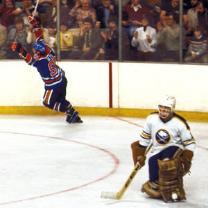 Wayne Gretzky of the Edmonton Oilers scores his NHL record-breaking 77th goal against Don Edwards of the Buffalo Sabres.