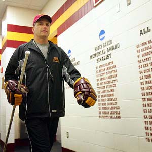 Don Lucia, who has coached the Golden Gophers to two NCAA titles, walks by a wall of fame featuring some of the finest players in college history. (Tom Dahlin/HHOF)