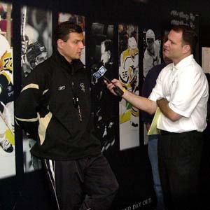 Pittsburgh head coach Eddie Olczyk answers questions in one of a number of training camp interviews. (Matt Polk/HHOF)