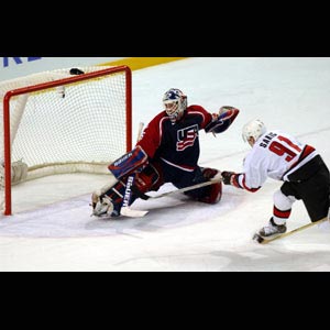 Joe Sakic fires home Canada's fifth goal on Mike Richter enroute to capturing his nation's first Olympic gold medal in fifty years.